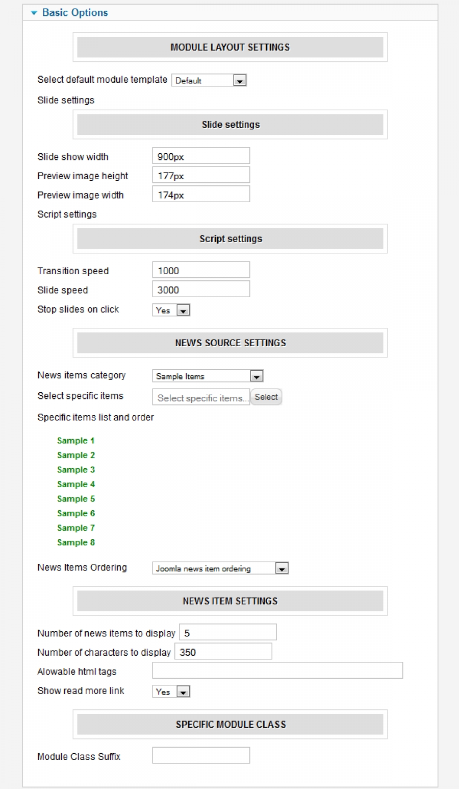 - Random, most popular or standard Joomla ordering news items display (demo above is set to random. Refresh the page)